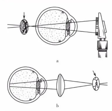 直接檢眼鏡(a)與間接檢眼鏡(b)成像原理的比較