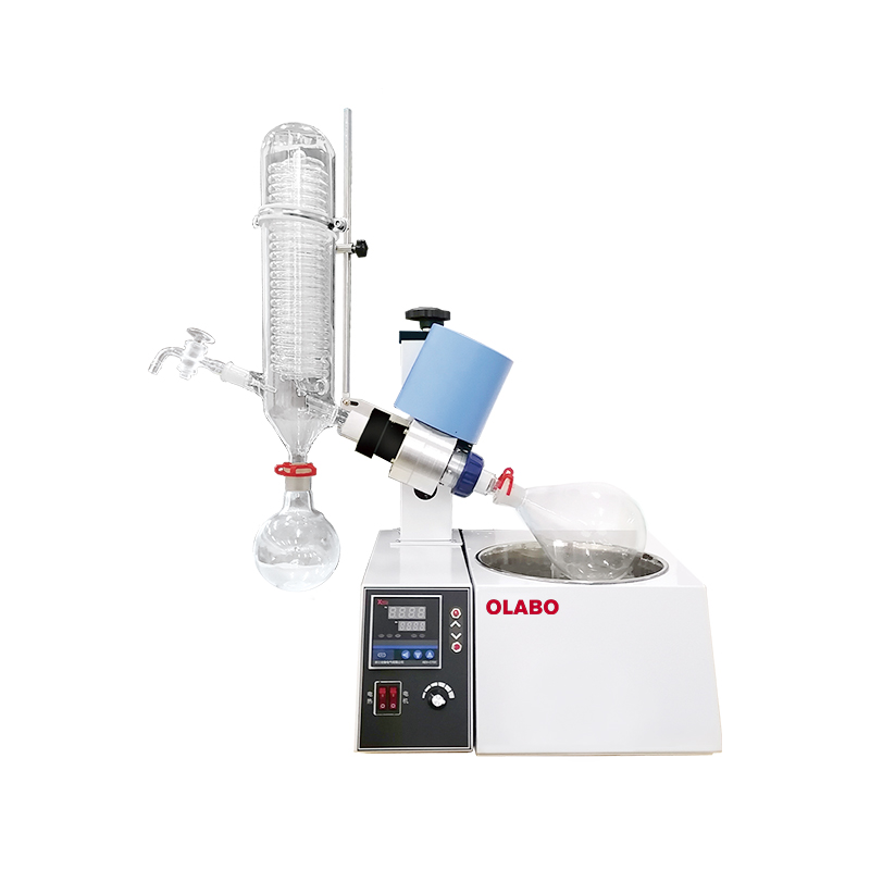 作為蒸餾的熱源,常配有相應的恒溫水槽。通過電子控制,使燒瓶在最適合速度下,恒速旋轉以增大蒸發(fā)面積。通過真空泵使蒸發(fā)燒瓶處于負壓狀態(tài)。蒸發(fā)燒瓶在旋轉同時置于水浴鍋中恒溫加熱,瓶內(nèi)溶液在負壓下在旋轉燒瓶內(nèi)進行加熱擴散蒸發(fā)。旋轉蒸發(fā)器系統(tǒng)可以密封減壓至 400~600毫米汞柱;用加熱浴加熱蒸餾瓶中的溶劑,加熱溫度可接近該溶劑的沸點;同時還可進行旋轉,速度為50~160轉/分,使溶劑形成薄膜,增大蒸發(fā)面積。此外,在高效冷卻器作用下,可將熱蒸氣迅速液化,加快蒸發(fā)速率。
