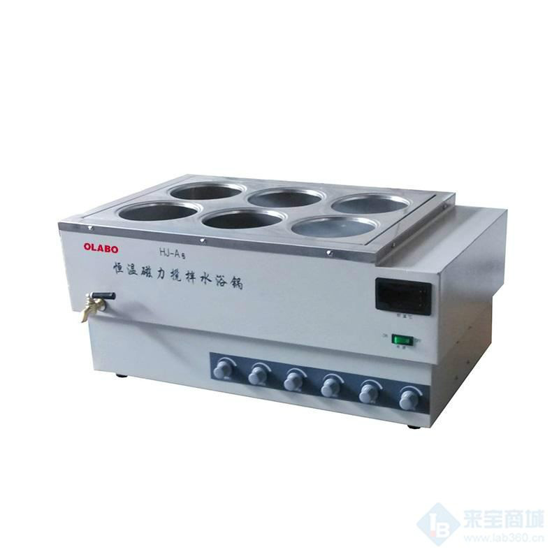 歐萊博 HJ-A6磁力攪拌恒溫水浴鍋HJ-A6磁力攪拌恒溫水浴鍋是輔助恒溫實驗儀器,由機箱、恒溫水槽和控溫裝置三部分組成。本儀器設有6個孔位,每個孔位可單獨進行攪拌,也可直接將攪拌子將放水浴鍋攪拌,這樣水浴鍋內溫度將更均勻,更較精確,適用于各實驗室作蒸發及恒溫加熱之用…