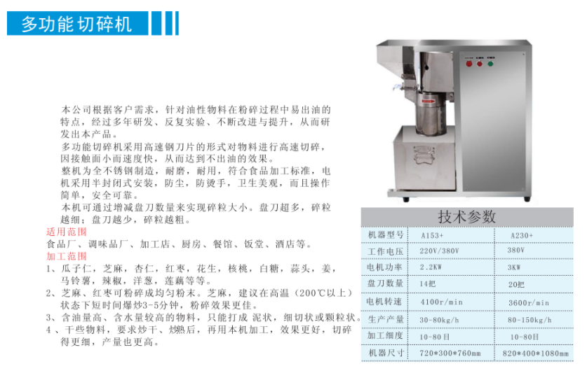 A153多功能切碎機接觸面小速度快,從而達到不出油的效果,全體不銹鋼,制造,耐磨,耐用,電機采用半封閉式安裝,防塵,防燙手,衛生美觀。…